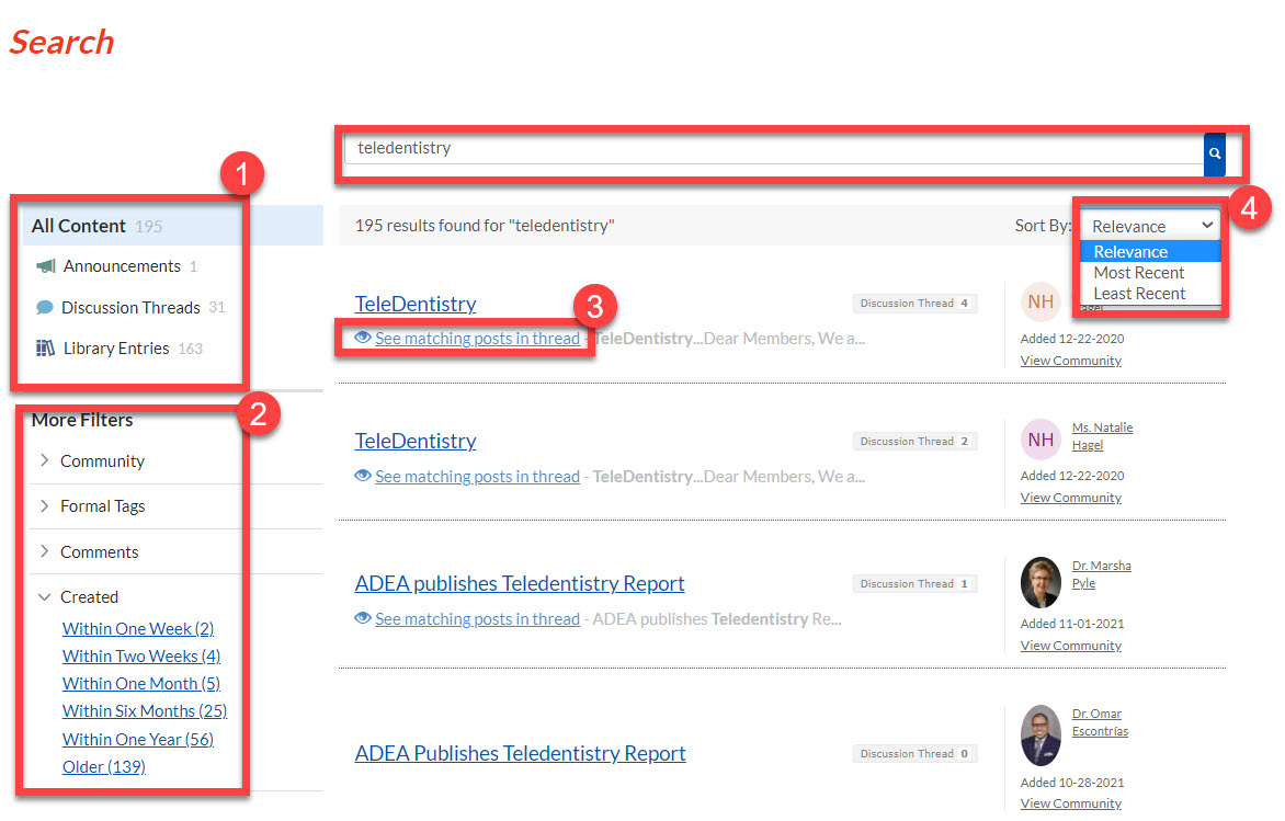 - Sort By:- Use this dropdown to sort your results by Relevance, Most Recent, or Least Recent.
